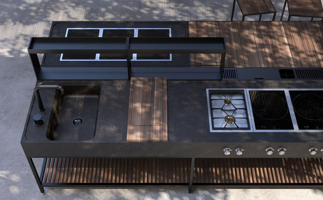 Terrenere is a modular kitchen system that includes a snack table and stools. The modules can be open or closed, with wooden or metal fronts, and both the frame and countertop are available in a wide range of colors. Terrenere can be equipped with a BBQ, gas burners, induction cooktop, grill, and teppanyaki. The faucet, like the entire structure, is made entirely of stainless steel. All wooden elements — including the cutting board — are made of Iroko wood. Accessories include an equipped channel and the cutting board